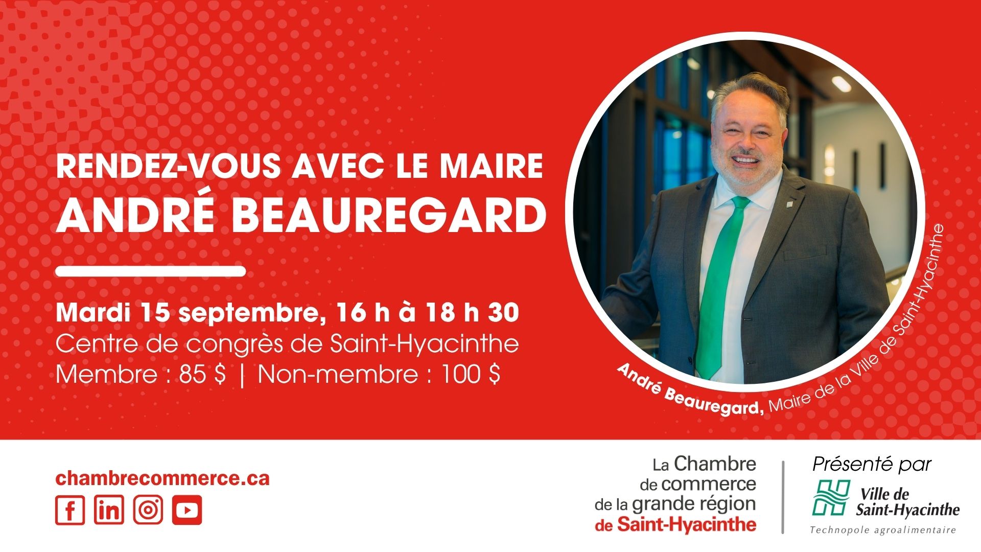 Le maire de la Ville de Saint-Hyacinthe, M. André Beauregard, invite la communauté d’affaires de la région à se joindre à lui le mardi 15 septembre prochain à l’occasion de l’événement « Rendez-vous avec le maire ».