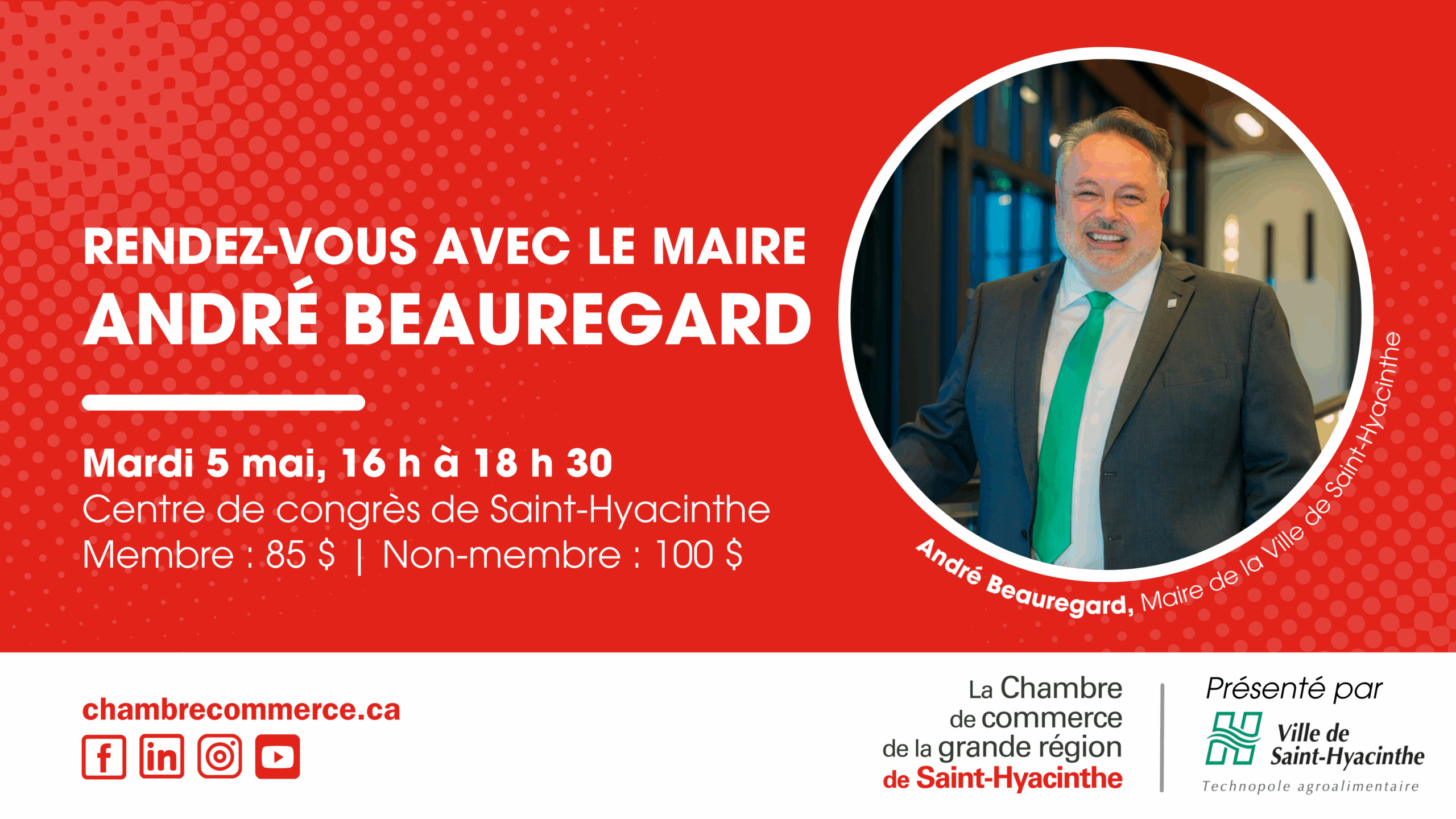 Le maire de la Ville de Saint-Hyacinthe, M. André Beauregard, invite la communauté d’affaires de la région à se joindre à lui le mardi 5 mai prochain à l’occasion de l’événement « Rendez-vous avec le maire ».
