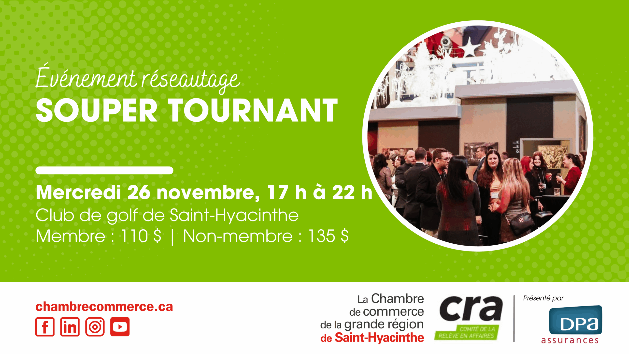 Lors de cet événement, le Comité de la relève en affaires de la Chambre de commerce de la grande région de Saint-Hyacinthe vous offre une opportunité de visibilité.*